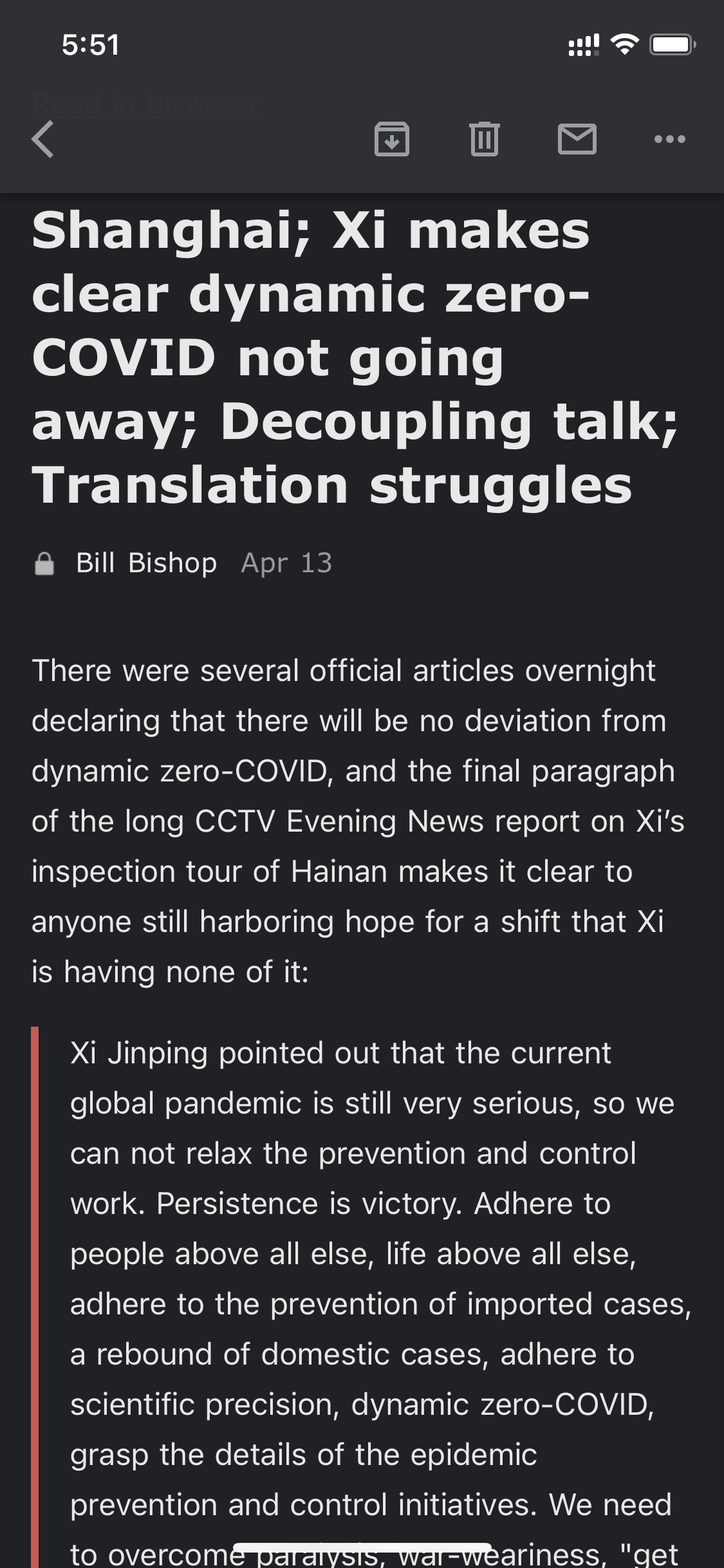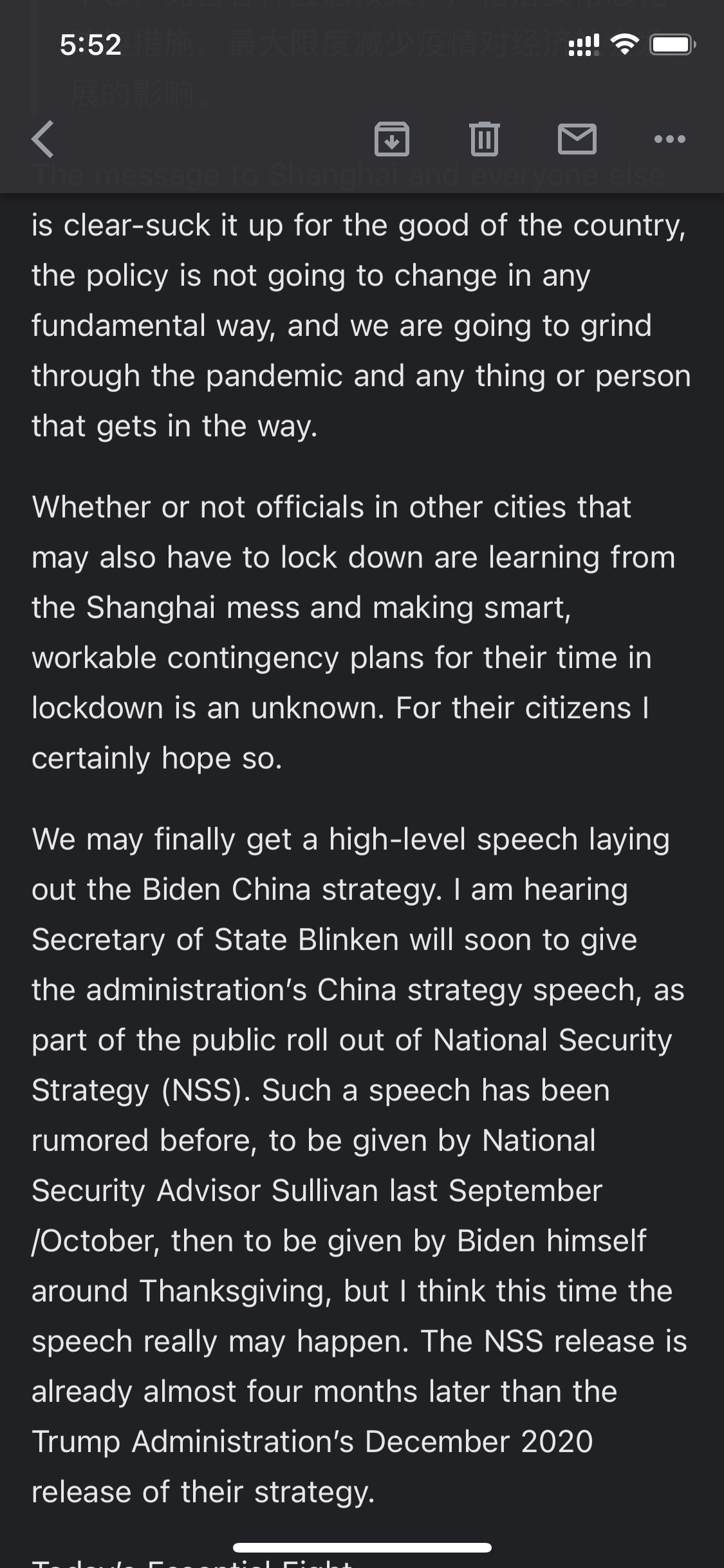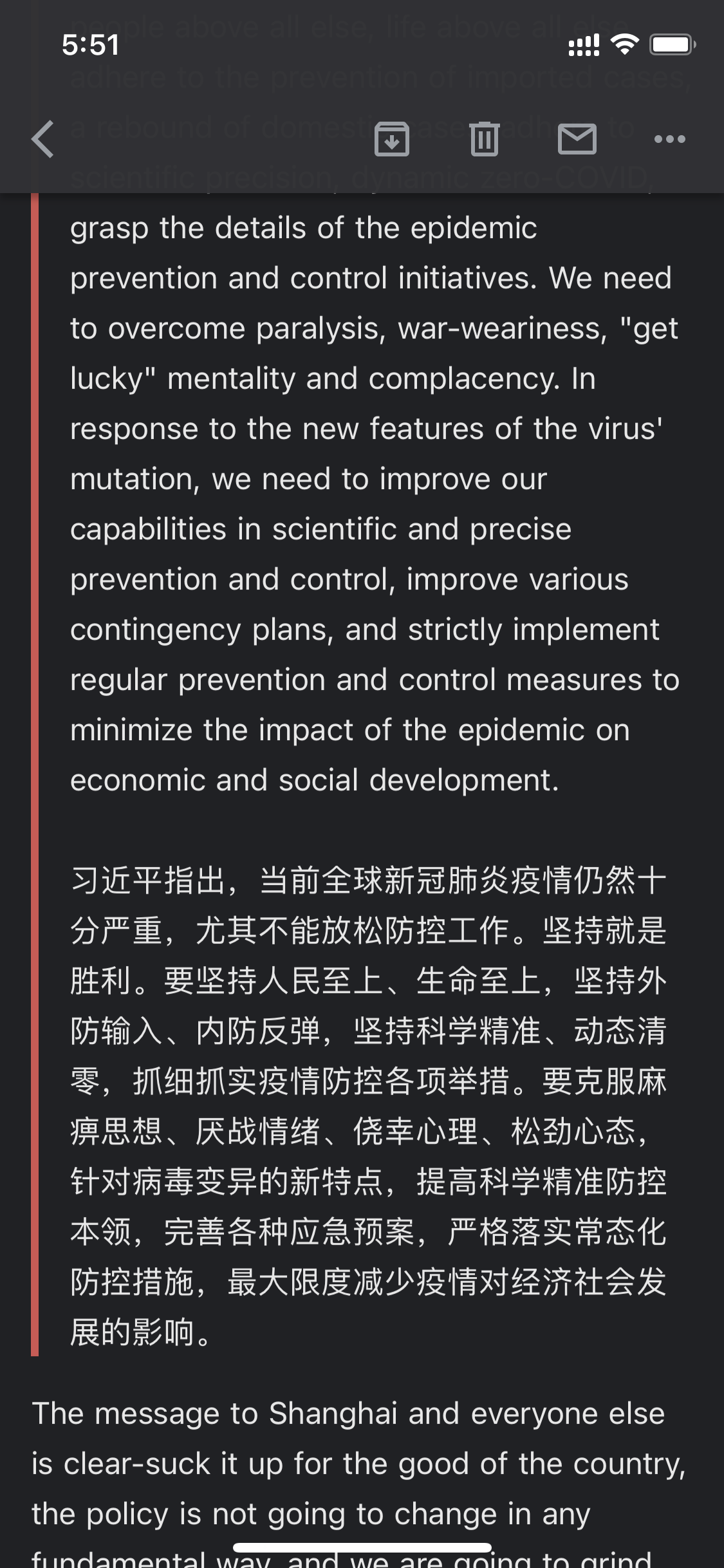 Xi makes clear dynamic zero-COVID not going away; The message to Shanghai and everyone else is clear-suck it up for the good of the country, the policy is not going to change in any fundamental way, and we are going to grind through the pandemic and any thing or person that gets in the way.