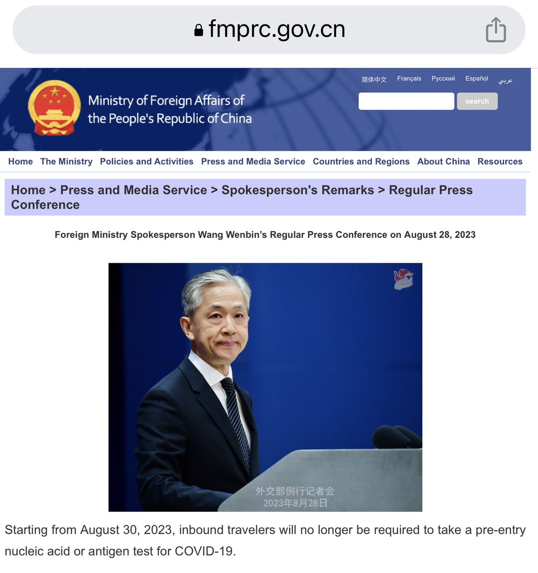 Starting August 30, 2023 (Wednesday), inbound travelers will no longer need to do a pre-entry nucleic acid or antigen test according to China’s Foreign Ministry as reported in their daily press conference on Monday, 8/28.
